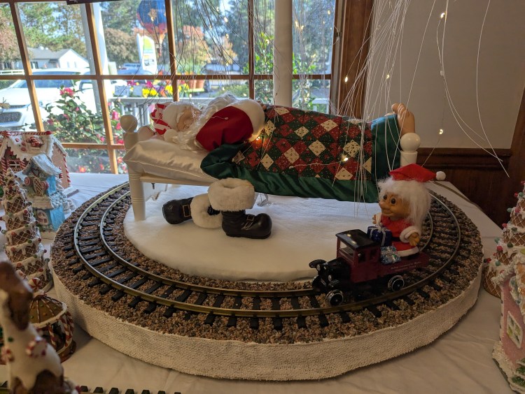 Before next year Mrs. Claus is going to need some “neck surgery”. Occasionally while bending over to kiss Santa she’ll bop the big guy on his noggin pretty hard. Being so old there is probably a joint that is worn out and I will have to try and cut her clothing back so we can get to her mechanicals.