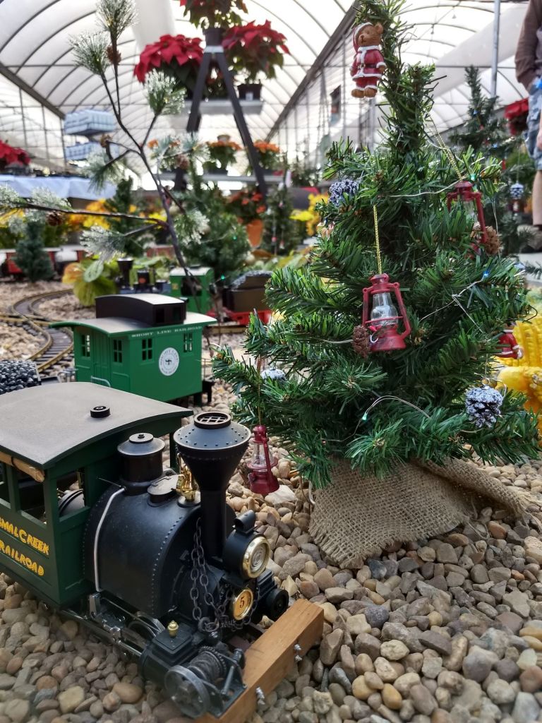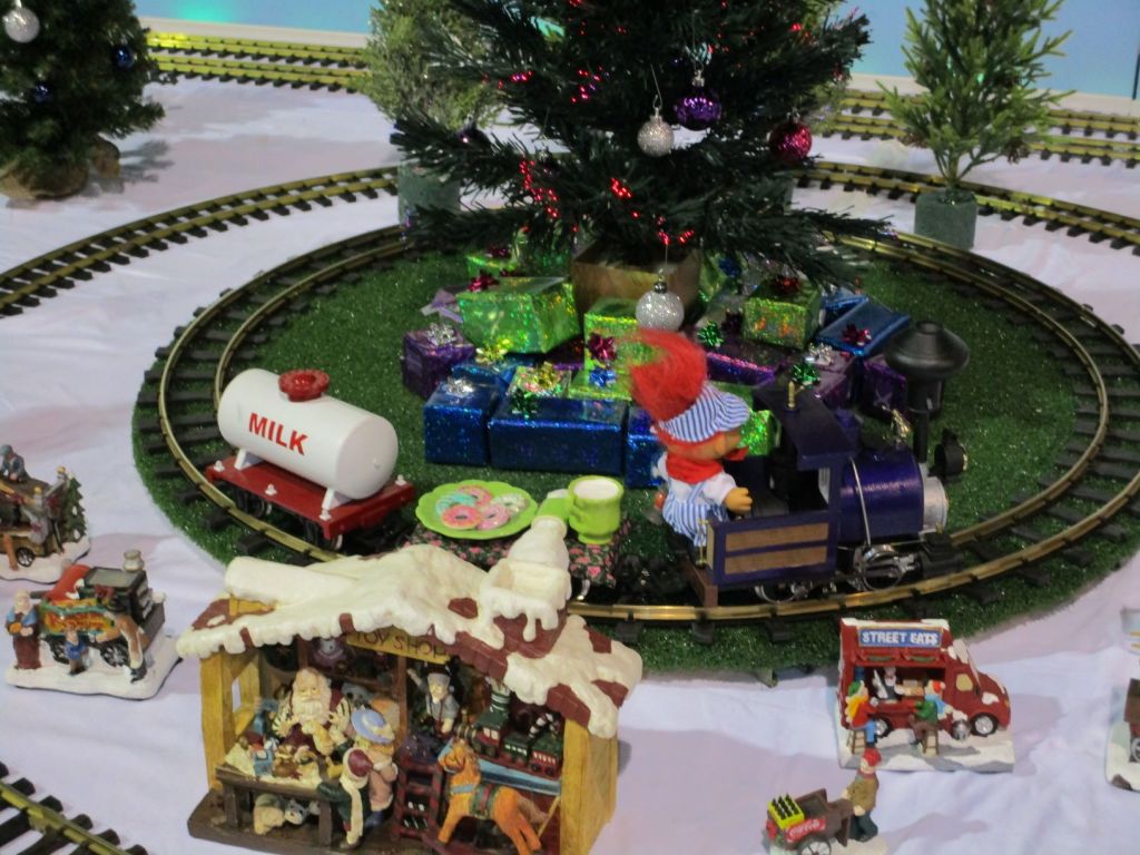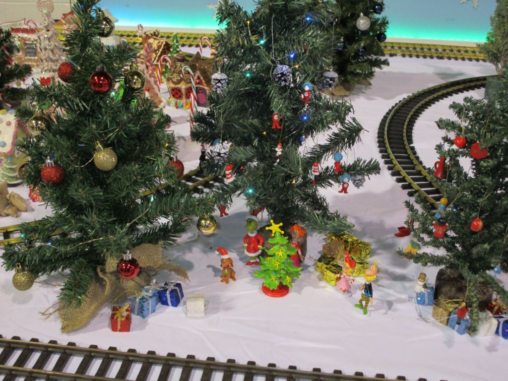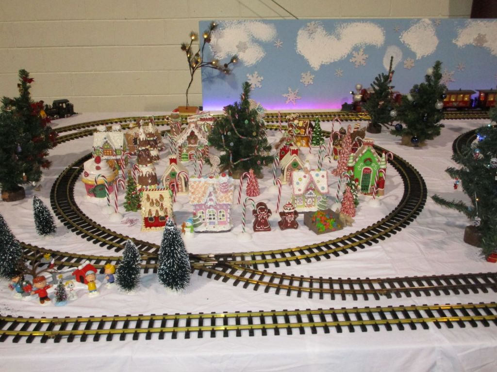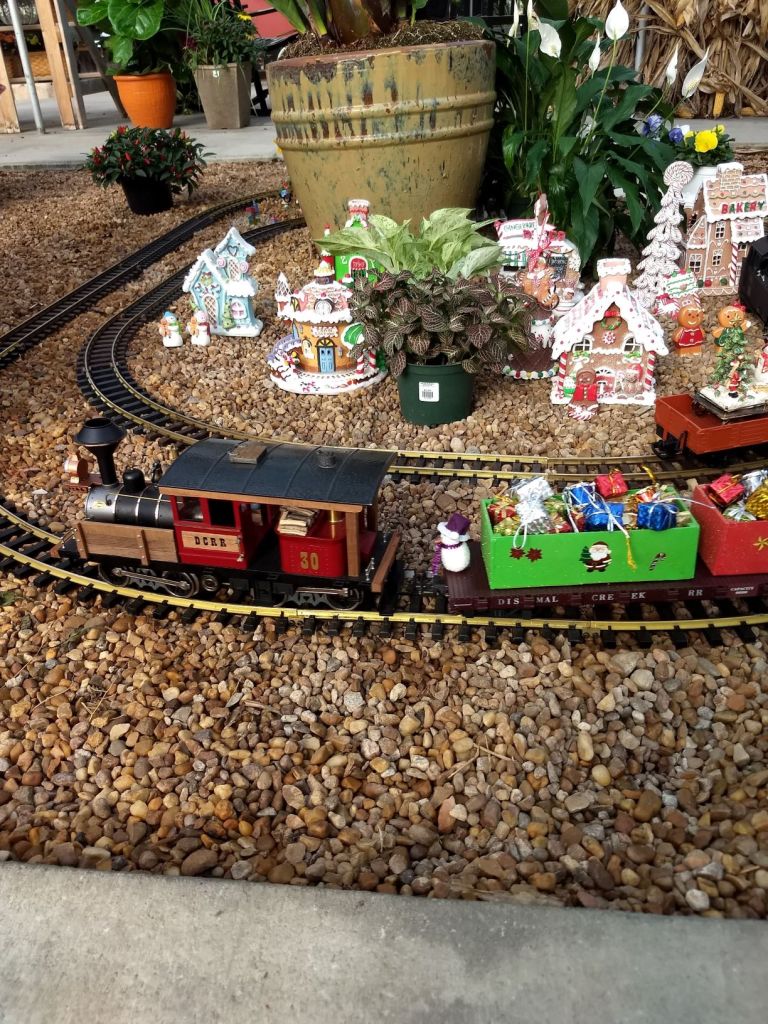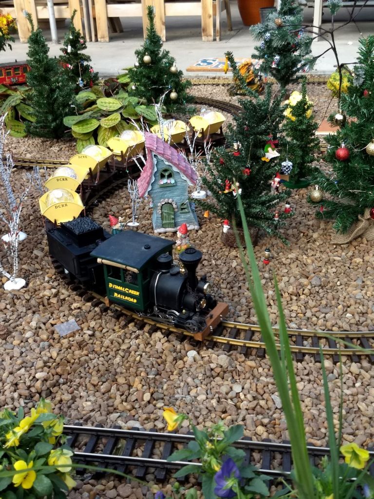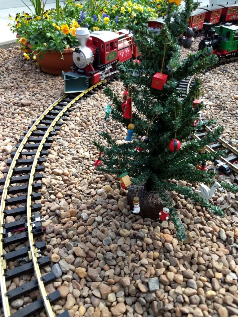 Since 2012 we have had an open house every year on Halloween and Christmas Eve. More properly an “Open Yard”, we decorate the train garden for the appropriate holiday, run trains and hang out with anyone who happens to stop by. On Halloween we hand out candy to the kids and chat with the grown-ups. And on Christmas Eve we have a table with hot chocolate, mulled cider and home-made cookies.