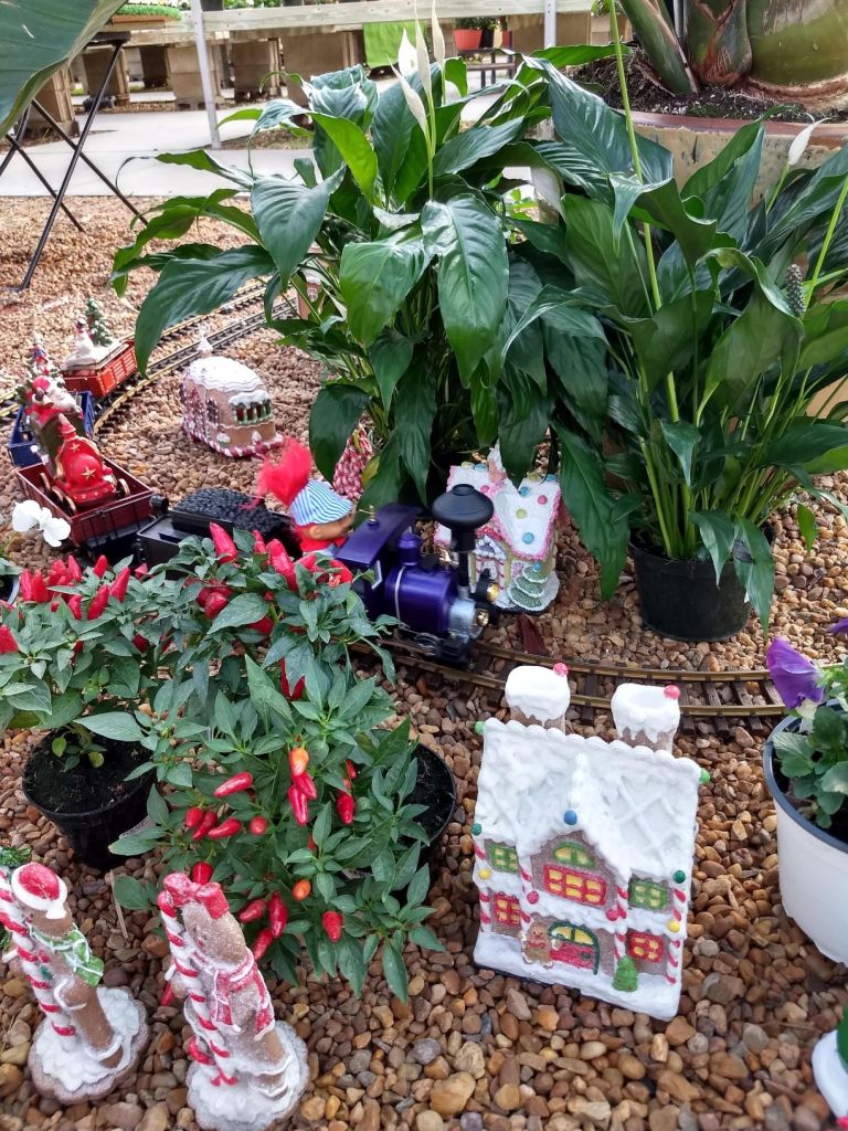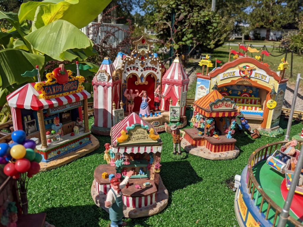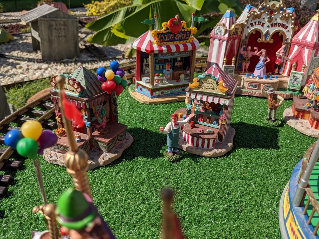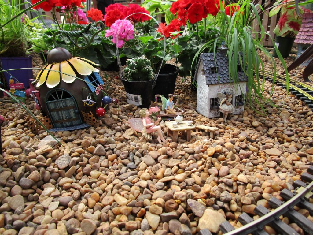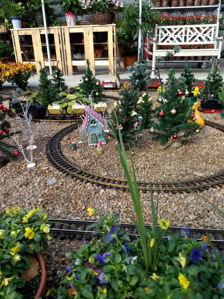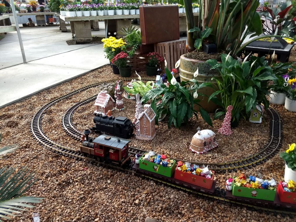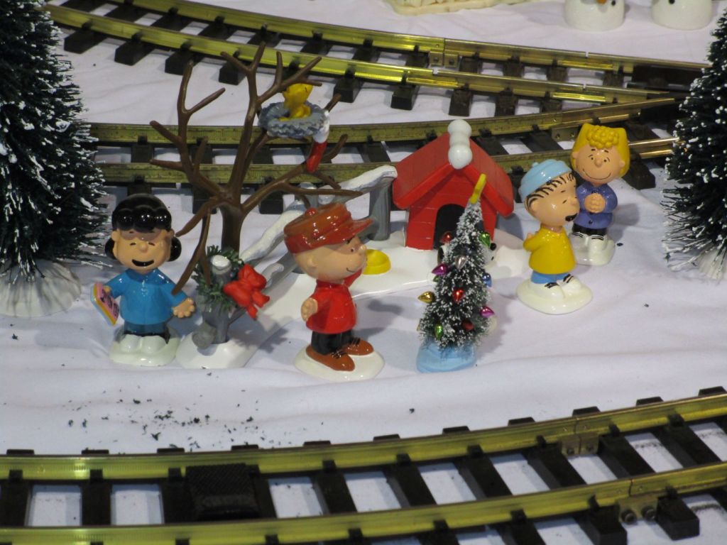 Since 2012 we have had an open house every year on Halloween and Christmas Eve. More properly an “Open Yard”, we decorate the train garden for the appropriate holiday, run trains and hang out with anyone who happens to stop by. On Halloween we hand out candy to the kids and chat with the grown-ups. And on Christmas Eve we have a table with hot chocolate, mulled cider and home-made cookies.
