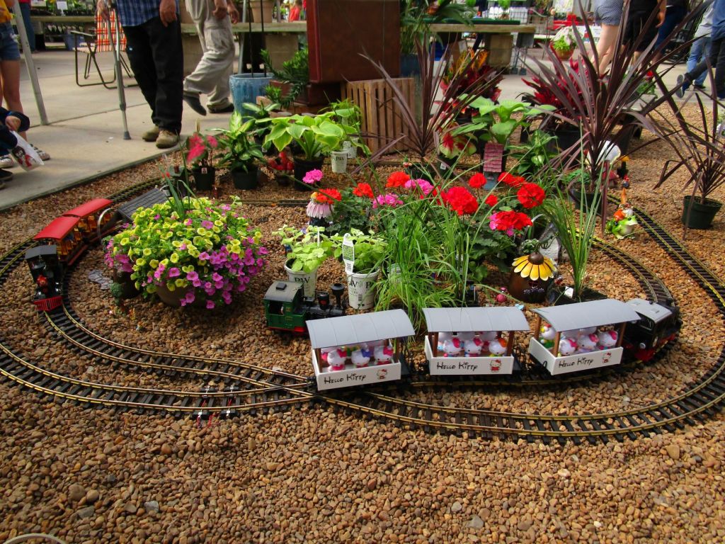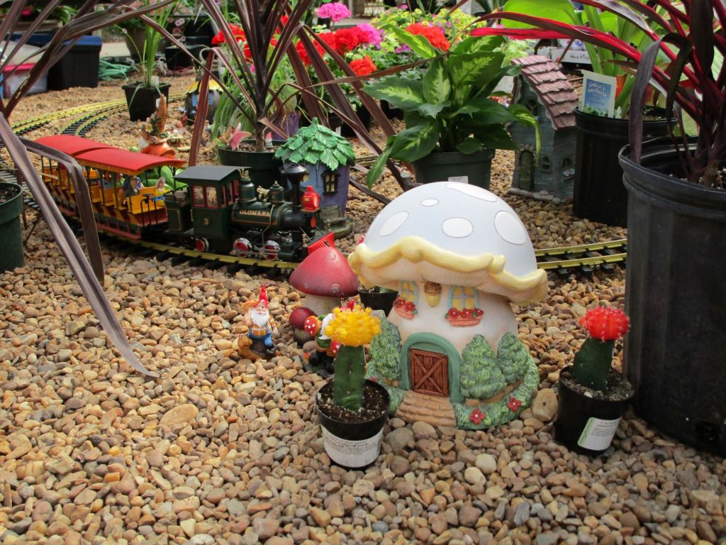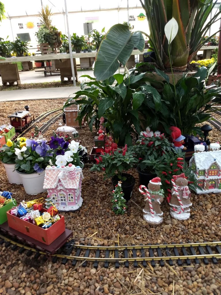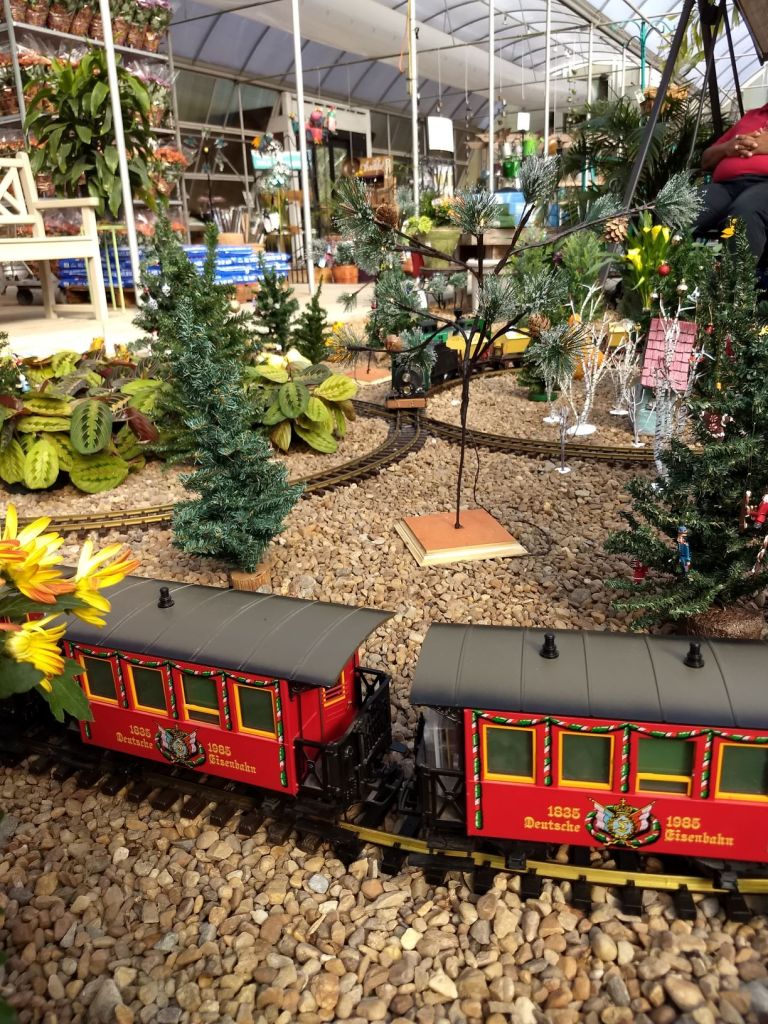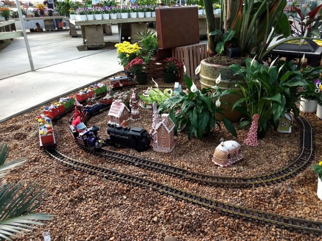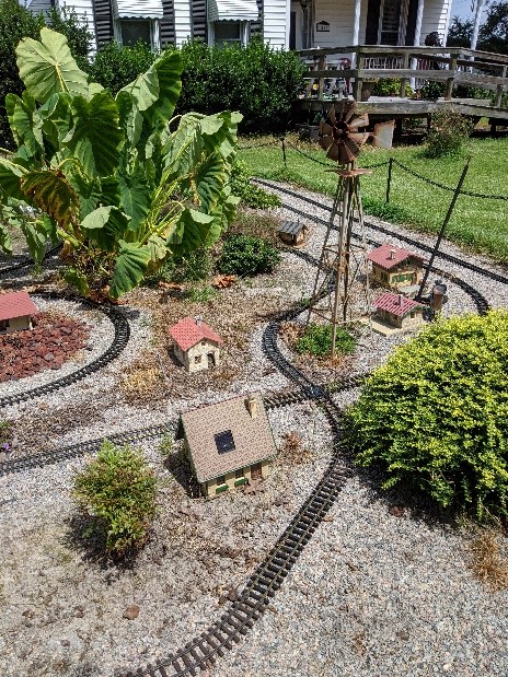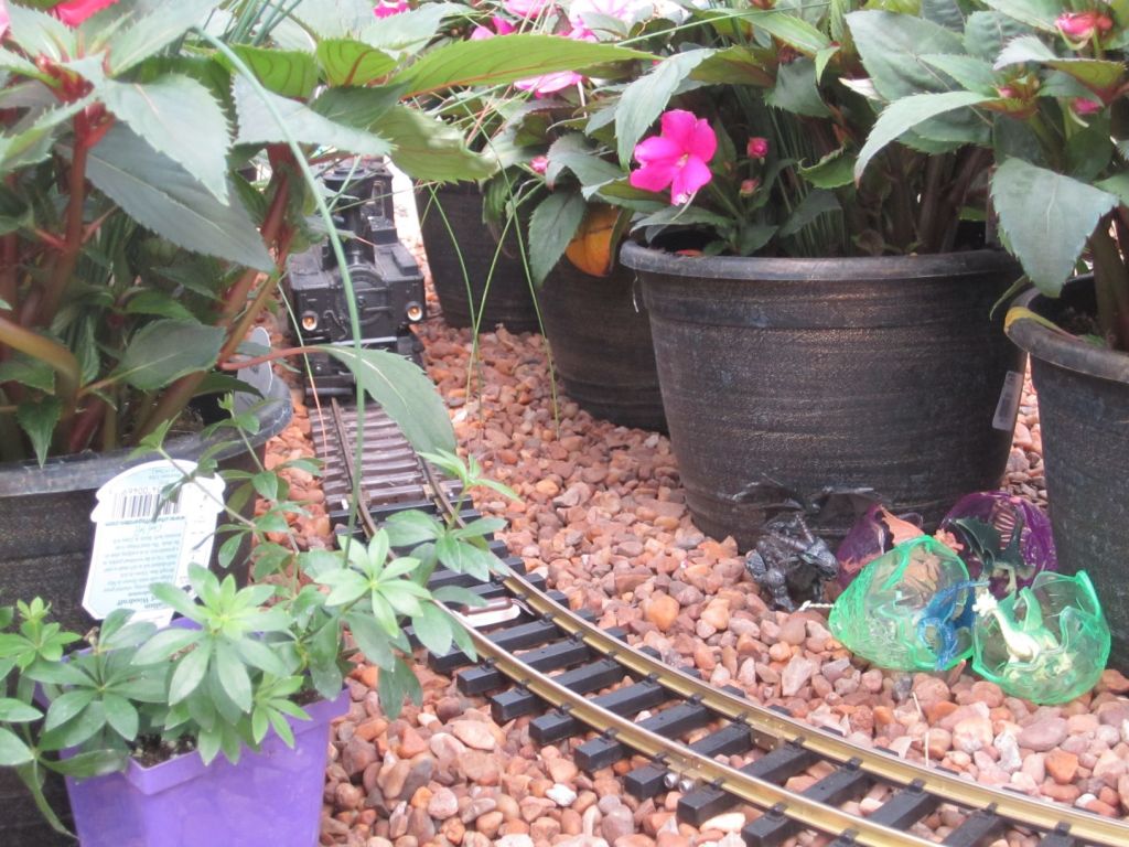 Since 2012 we have had an open house every year on Halloween and Christmas Eve. More properly an “Open Yard”, we decorate the train garden for the appropriate holiday, run trains and hang out with anyone who happens to stop by. On Halloween we hand out candy to the kids and chat with the grown-ups. And on Christmas Eve we have a table with hot chocolate, mulled cider and home-made cookies.