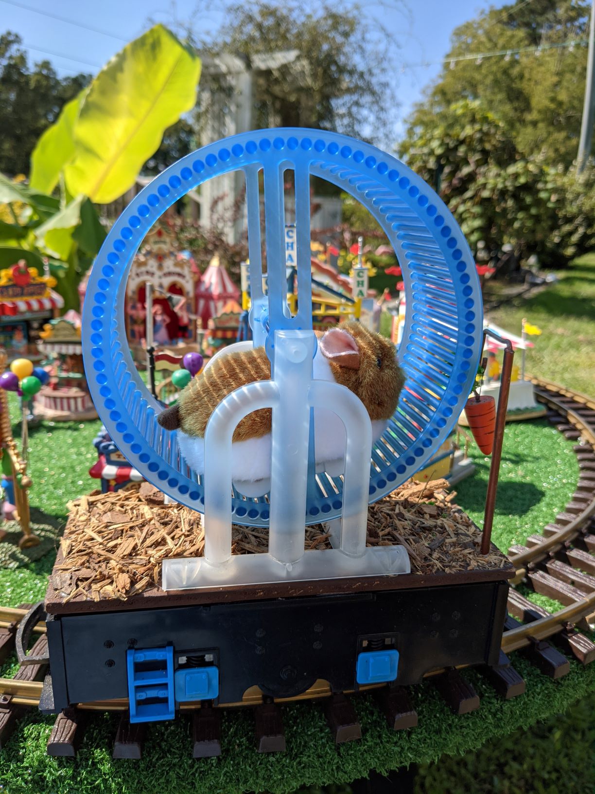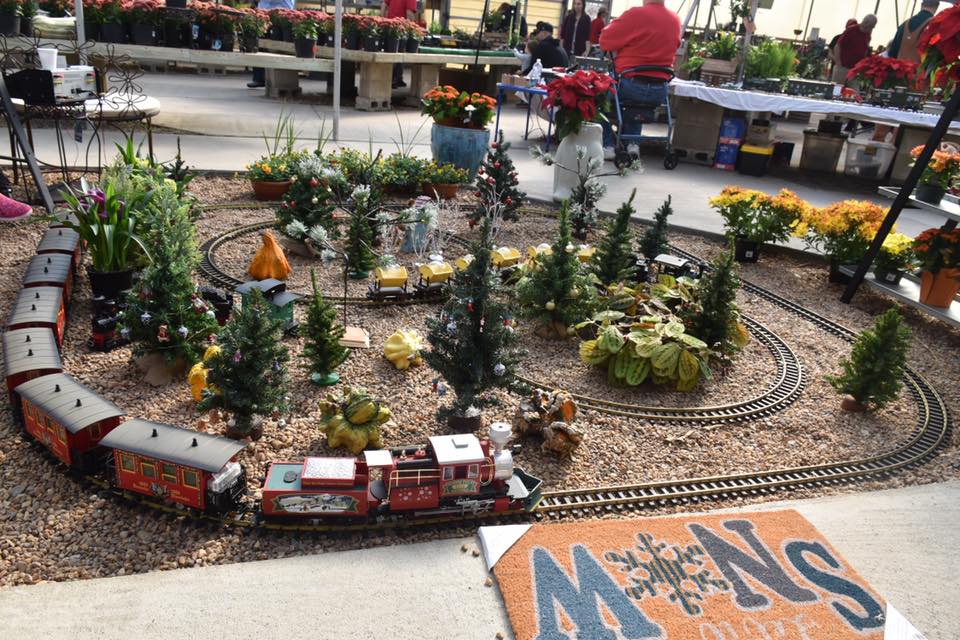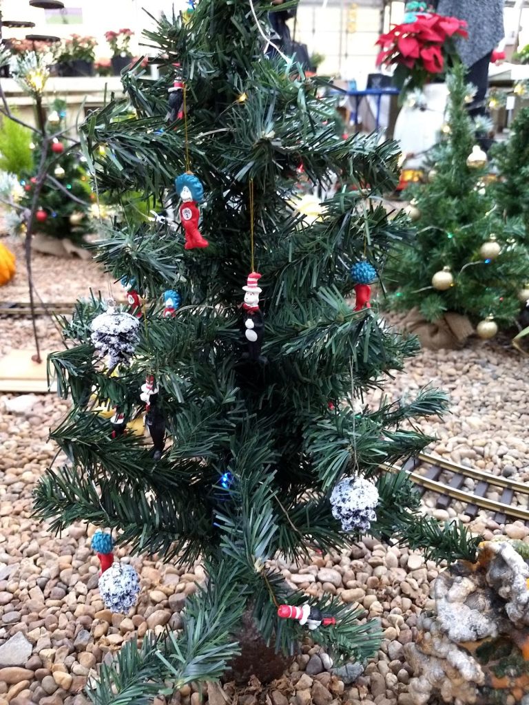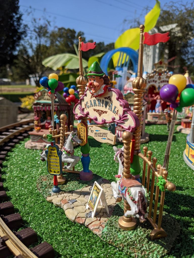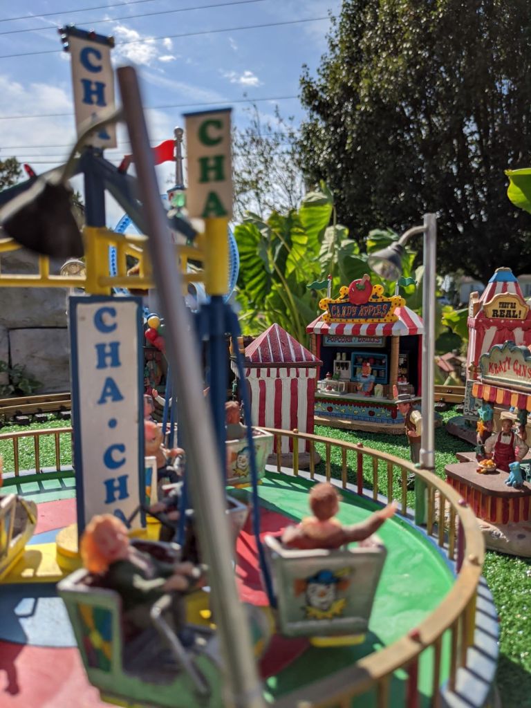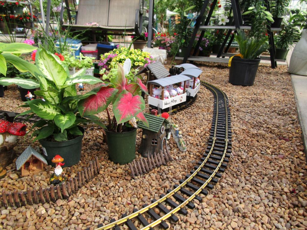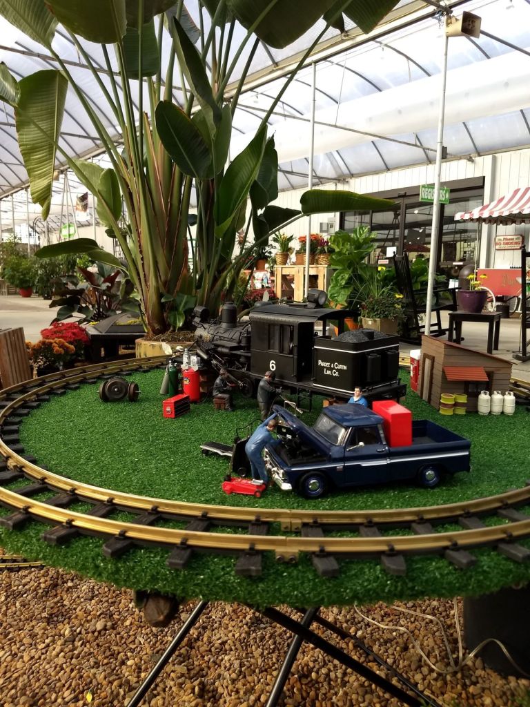 Since 2012 we have had an open house every year on Halloween and Christmas Eve. More properly an “Open Yard”, we decorate the train garden for the appropriate holiday, run trains and hang out with anyone who happens to stop by. On Halloween we hand out candy to the kids and chat with the grown-ups. And on Christmas Eve we have a table with hot chocolate, mulled cider and home-made cookies.