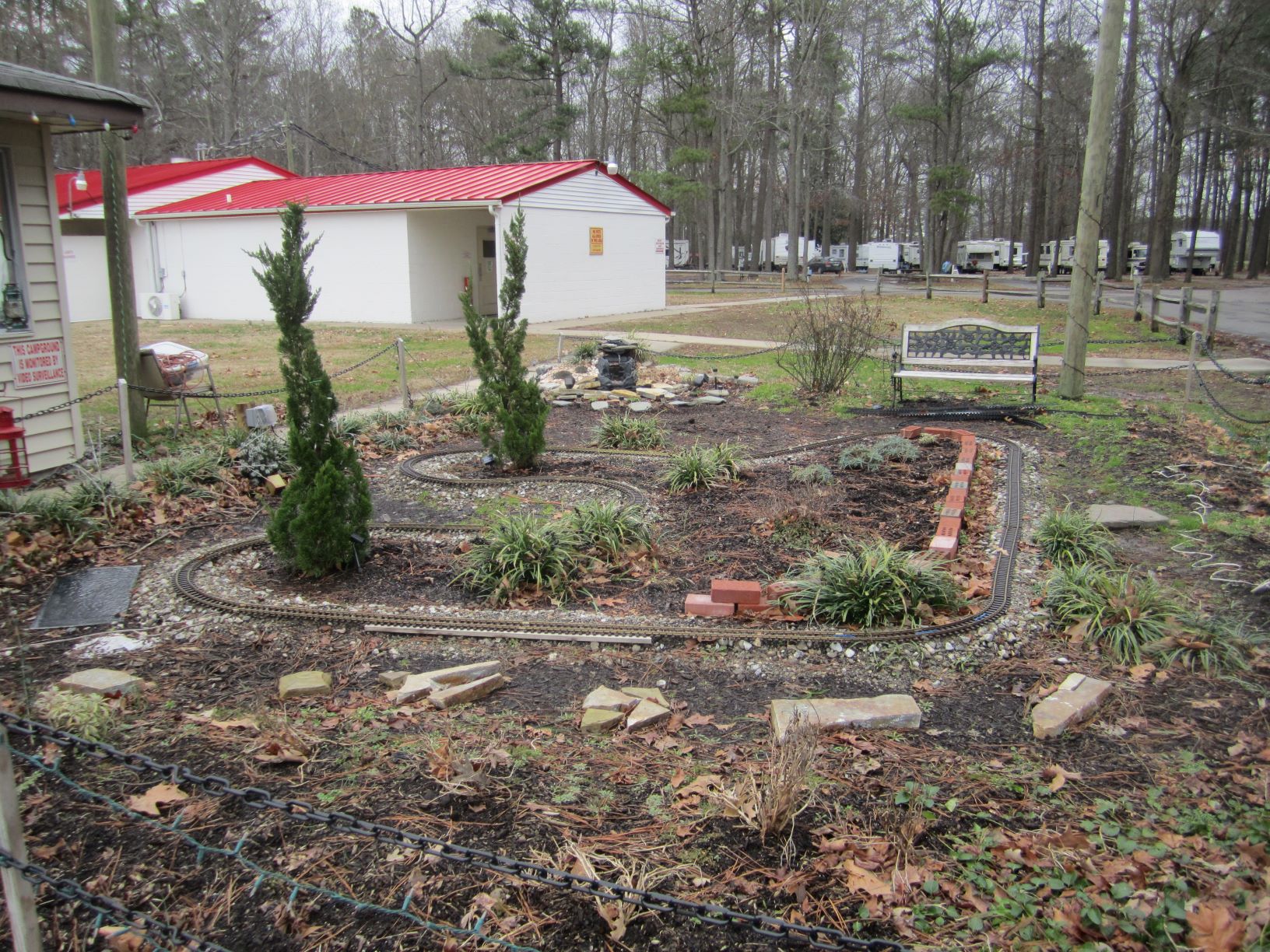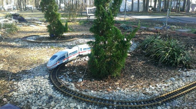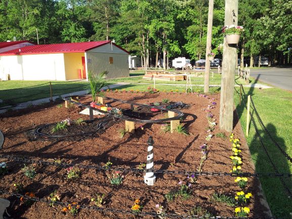 Our first garden train layout was laid down in 2013 at Chesapeake Campground. We had a largish indoor model train layout in the campground recreation room so people were always bringing by train related “stuff”. One thing that seemed to accumulate was plastic track and battery powered trains in G Scale. It was much too big to set up inside the Train Room so we did a land grab for the front yard of the rec room. It was plastic track and battery operated trains. While my husband had experience with O Gauge, HO and N scale trains he really didn’t know much about G Scale and running trains outside. And I had no clue about any of it. It showed when we set up our first tracks.